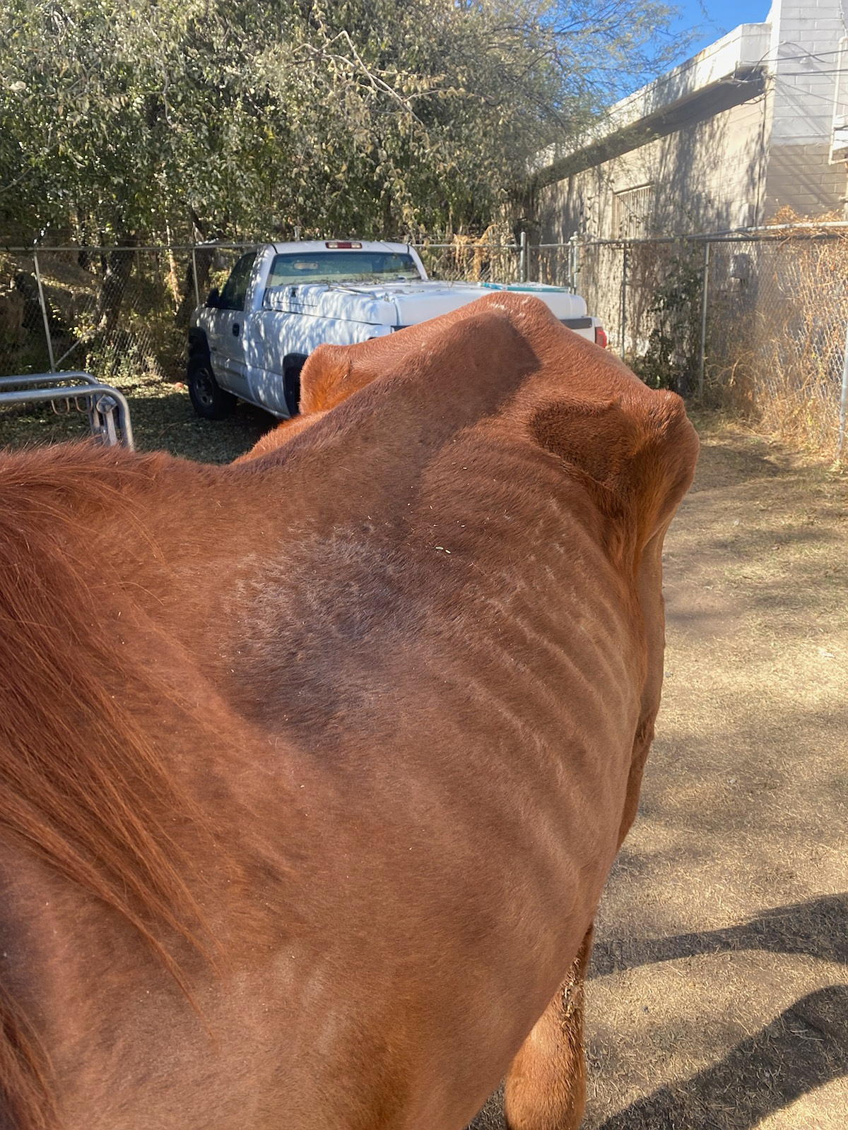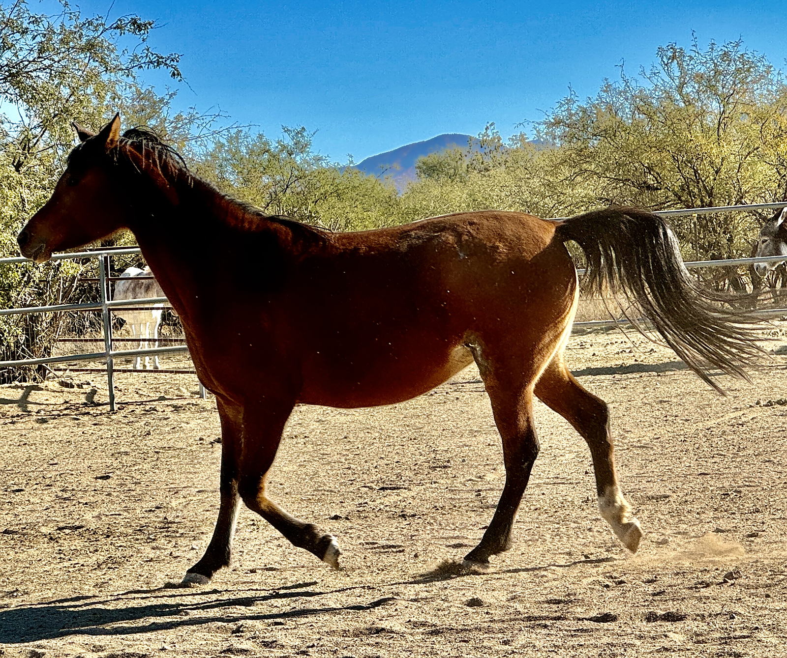 This sweet girl was near death when she arrived at Equine Voices in the middle of the night on August 22, 2022. She had been dragged and had open wounds of her back left hip that required 6 weeks of intensive care at Arizona Equine Medical & Surgical Centre in Gilbert.